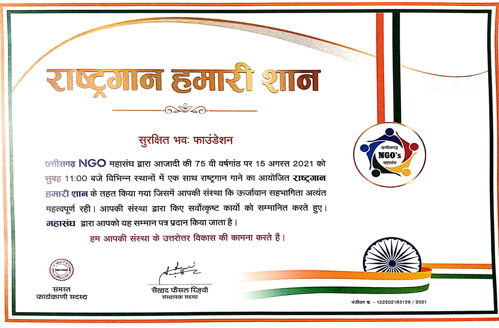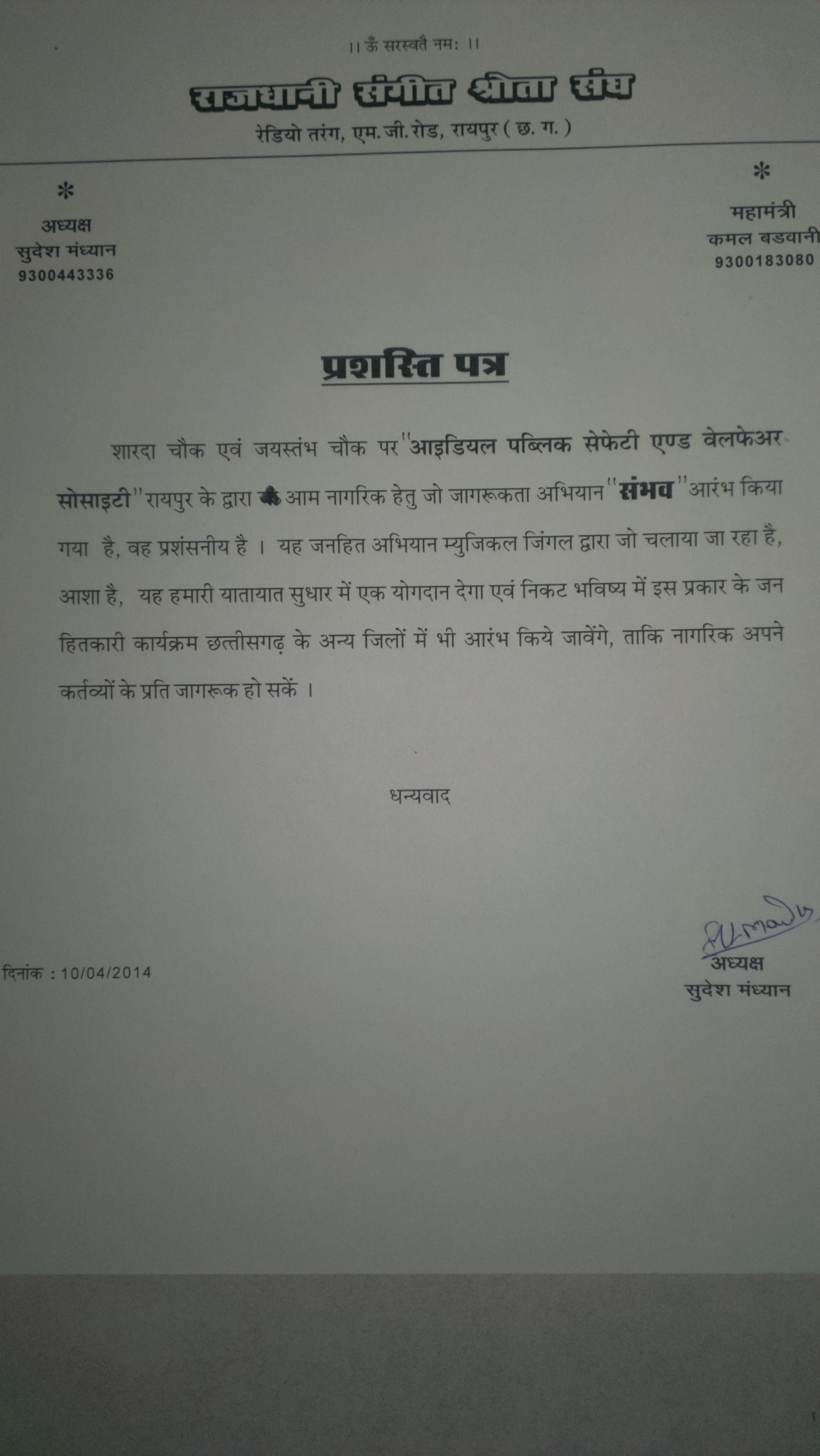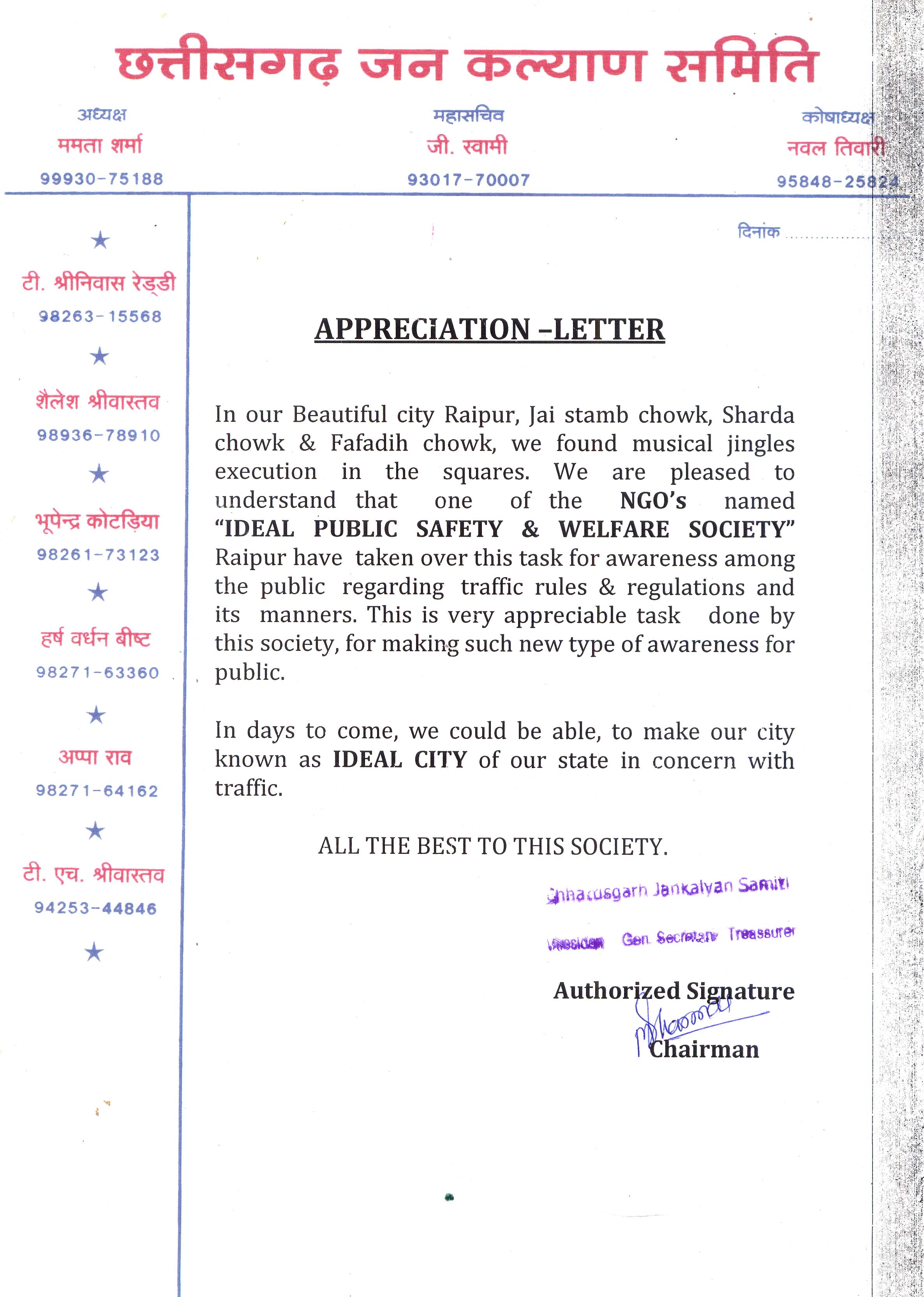 CG Jan kalyaan Samiti Appreciation letter